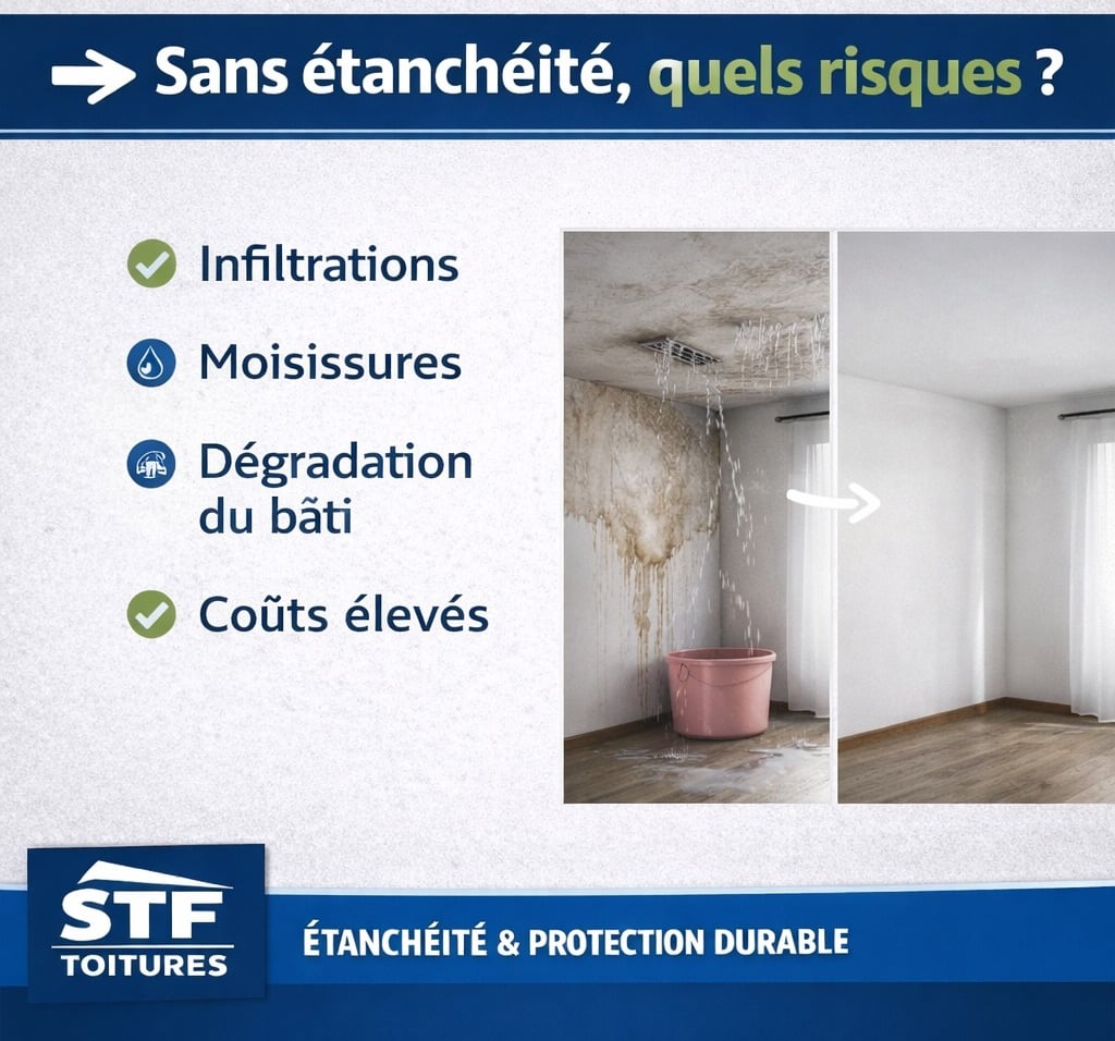 STF Toitures localise et répare la fuite, vite et durablement.
