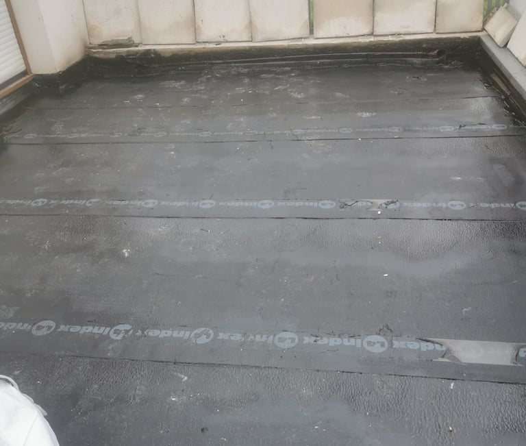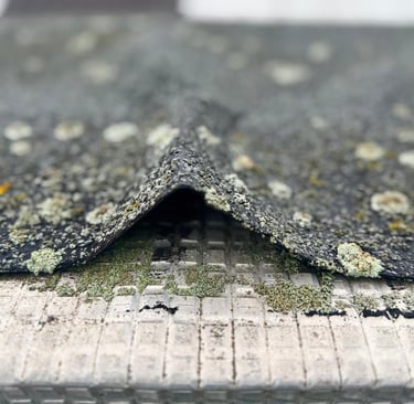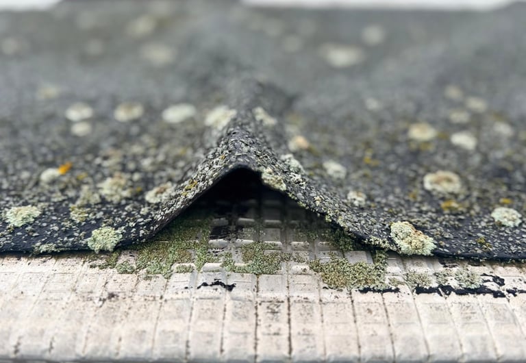 Sur cette photo, on observe une membrane d’étanchéité bitumineuse fortement dégradée, avec soulèvement et présence de mousses. Ce type de désordre est un signal critique d’infiltration à venir pouvant entraîner des dégâts importants sur la structure (dalle béton, isolation, plafonds).